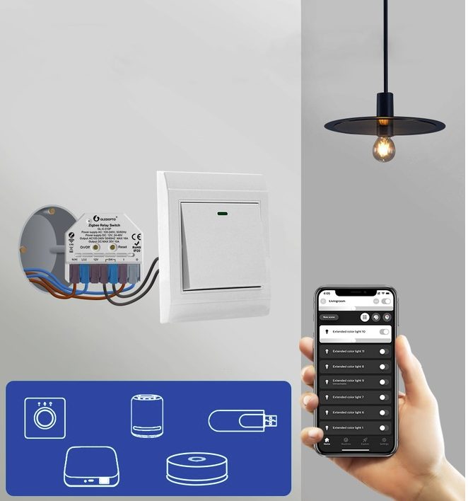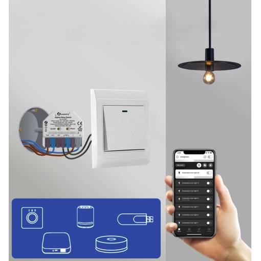 Beépített szerelvény modul kompatibilis a Zigbee 3.0 protokollal relés kimenettel. Ez egy sokoldalú és rugalmas megoldás széleskörű felhasználási lehetőségekkel. A ZigBee 3.0 technológiának köszönhetően intelligens vezérlést támogat, miközben manuálisan is vezérelheti a hagyományos kapcsolók vagy gombok segítségével.