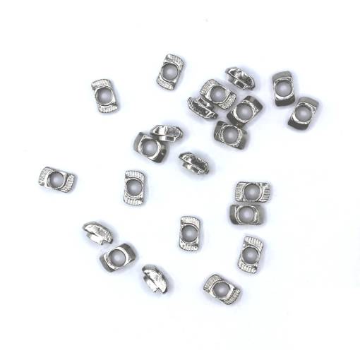 M5-ös acél anya, amely alumínium profilok 30x30 sínjébe illeszkedik. Az anya formája lehetővé teszi az egyszerű szerelést és szétszerelést közvetlenül a profil oldaláról, anélkül, hogy szükség lenne betolásra vagy speciális kulcsra. A sínezés az anyán biztonságosan rögzíti a meghúzott anya helyzetét a választott helyen.