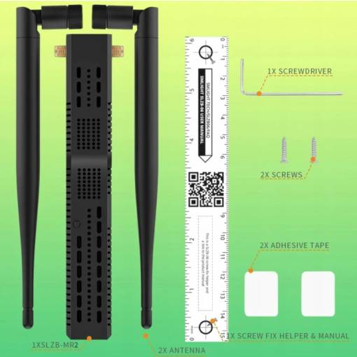 A csomag tartalmaz: SLZB-MR2 multirádiós átjáró, 2x antenna, csavarhúzó, 2x szerelési csavar, QR kézikönyv, 2x ragasztószalag