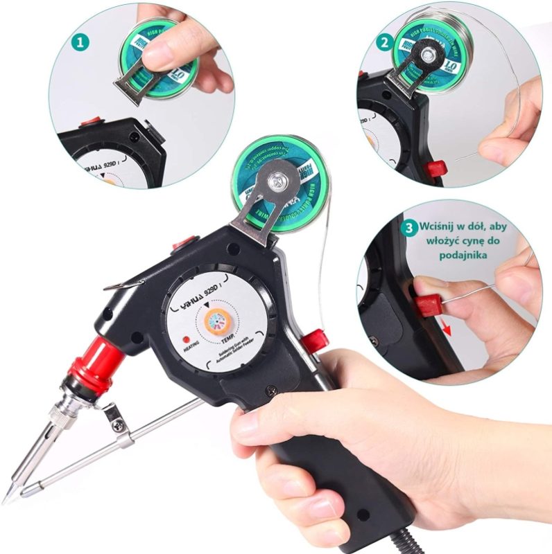 Automatikus huzaladagoló – kényelem és hatékonyság egy kézzel – Az integrált automatikus huzaladagoló lehetővé teszi a forrasztást egy kézzel, ami jelentősen megkönnyíti a munkát és felgyorsítja a forrasztást – különösen sorozatgyártás során vagy ott, ahol szükség van a másik kéz szabadon tartására.