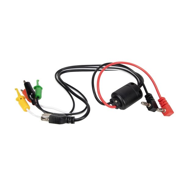 A kimenet 4 mm-es banáncsatlakozó párjával valósul meg. A csomag tartalmaz egy banánkábel, amely a kimenetet krokodilcsipeszre és horgos szondákra osztja.